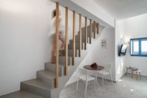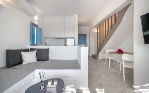 It is a maisonette with a staircase and two shower bathrooms. Spacious with modern furniture and a fully equipped kitchenette. A double built- in bed 2,00x1,60m and a big corner couch for two guests. Panoramic view of the sea and village. Accommodates up to 4 guests. Size appr. 61 sq. meters
